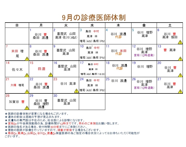 2025年9月診療医師体制■ 2025年8月3日 9月の医師シフト掲載いたします。 医師の希望がある方はご確認の上、ご来院くださいますようお願いいたします。 恐れ入りますが、よろしくお願いいたします。 9/5 本日増野先生が急遽新小岩での午後の診療お休みとなりました。午後は谷川先生・髙津先生の2名体制となります。 ※医師の変更がある場合は更新致します。予めご了承ください。 ※最終更新日 R7.9. 5