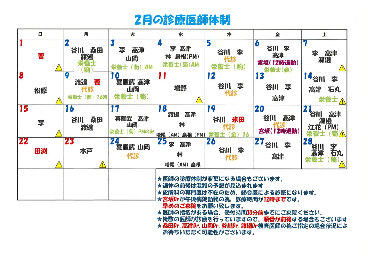 2026年2月診療医師体制■ 2026年2月3日 2月の医師シフト掲載いたします。 医師の希望がある方はご確認の上、ご来院くださいますようお願いいたします。 恐れ入りますが、よろしくお願いいたします。 ※医師の変更がある場合は更新致します。予めご了承ください。