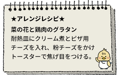 - 菜の花・鶏肉は食べやすい大きさに切る。